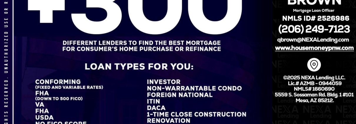 Hi, my name is Quinton Brown. I’m a Loan Officer with NEXA Lending LLC., offering personalized mortgage solutions, fast customized quotes, great rates and service with integrity.