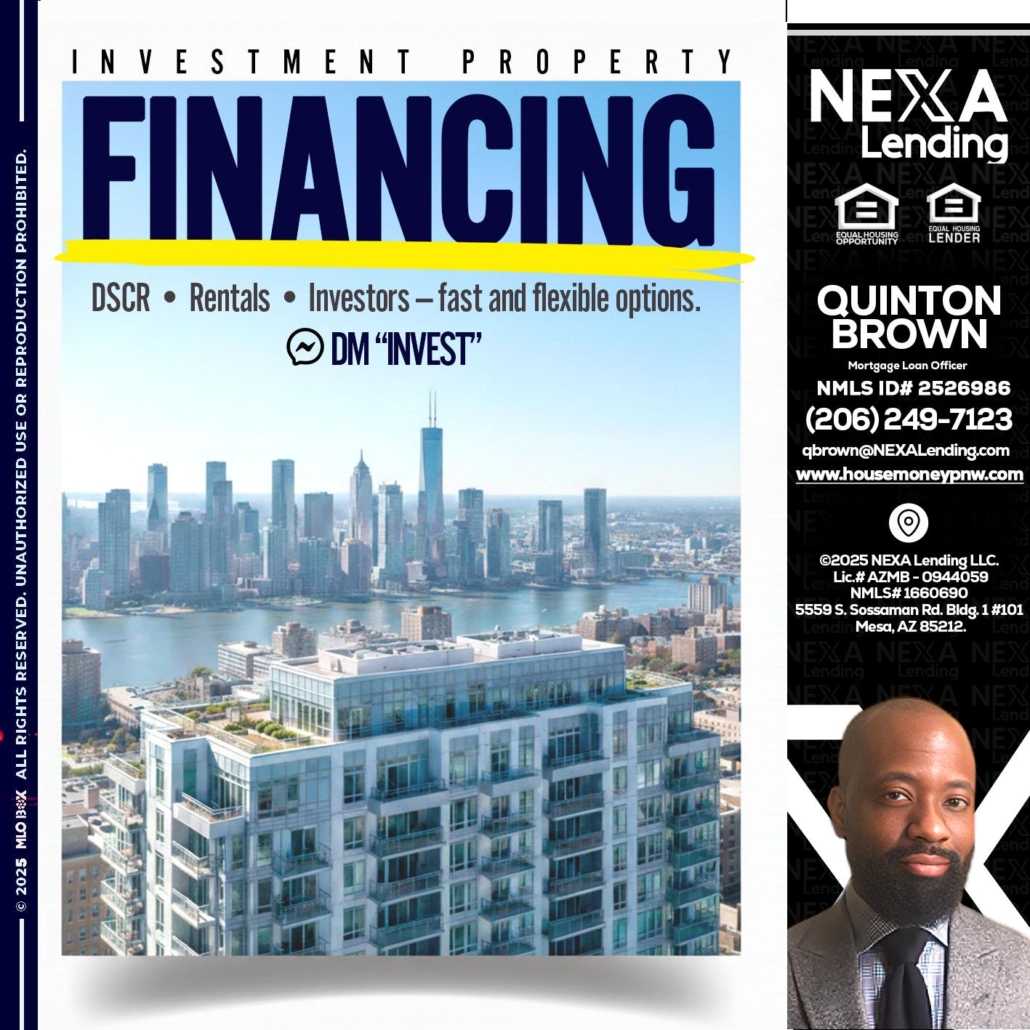 FINANCING - Quinton Brown -Mortgage Investment ConsultantHi, my name is Quinton Brown. I’m a Loan Officer with NEXA Lending LLC., offering personalized mortgage solutions, fast customized quotes, great rates and service with integrity.