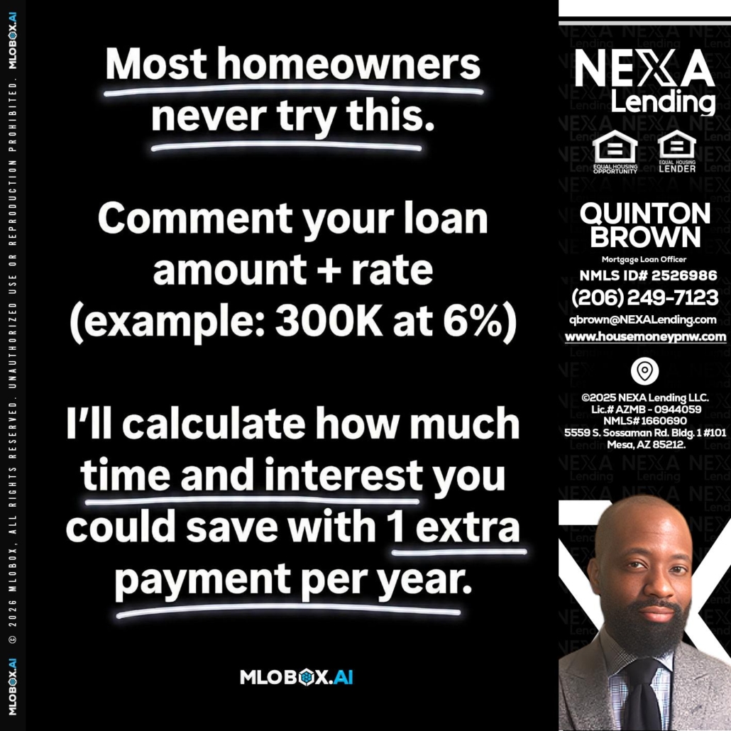 Hi, my name is Quinton Brown. I’m a Loan Officer with NEXA Lending LLC., offering personalized mortgage solutions, fast customized quotes, great rates and service with integrity.