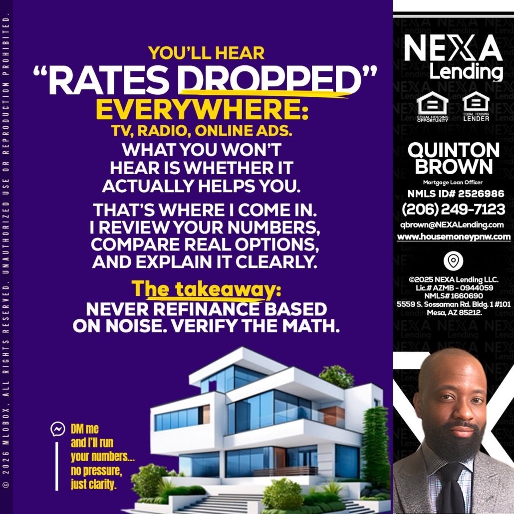 Hi, my name is Quinton Brown. I’m a Loan Officer with NEXA Lending LLC., offering personalized mortgage solutions, fast customized quotes, great rates and service with integrity.